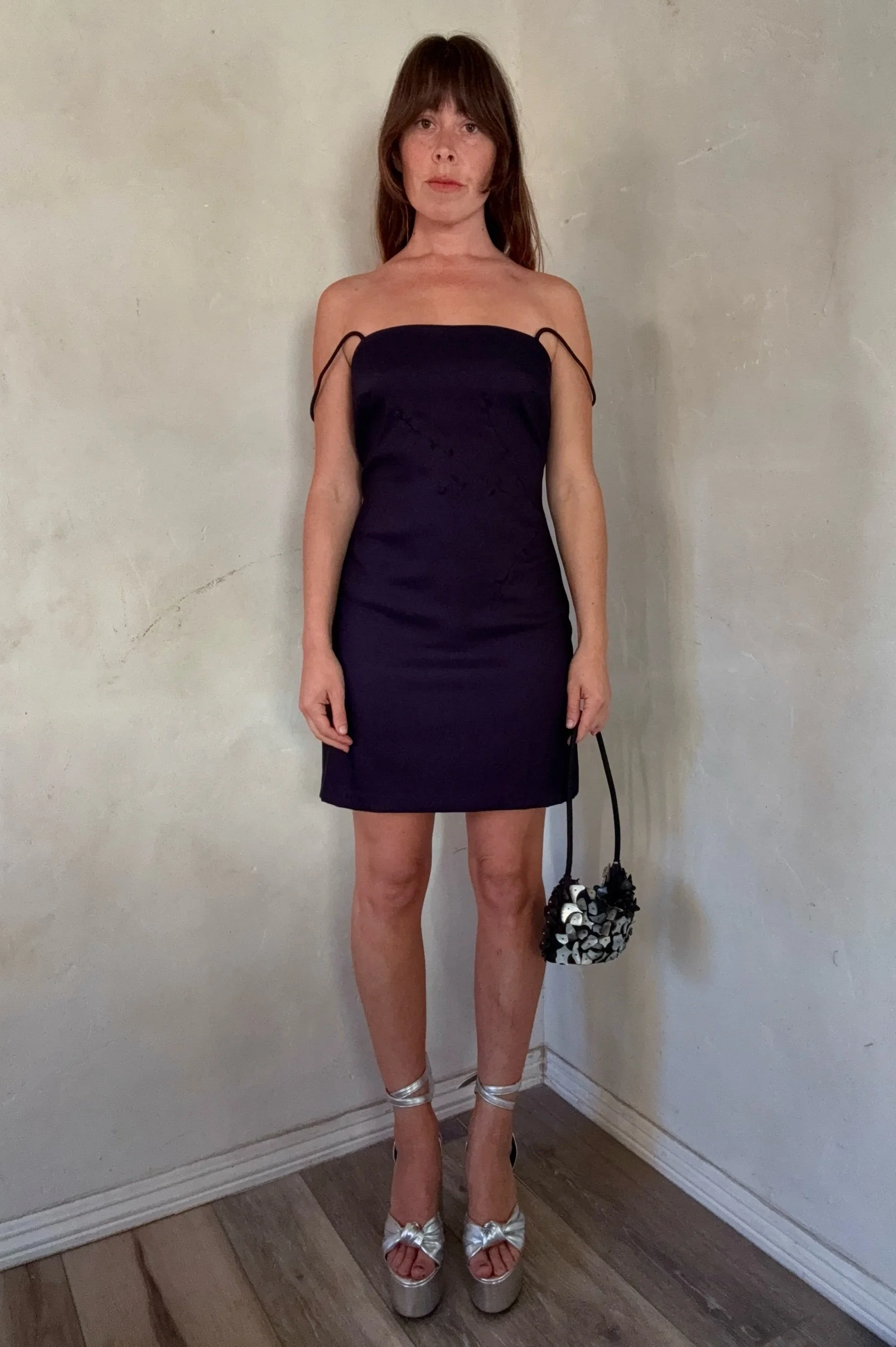 Vintage iridescent purple tube dress with rosette embroidery on front. Slits up side hems and has hidden zipper closure. By Rampage and made in USA. Cute for going out or a cocktaily semi formal event but could also easily be dressed down.
